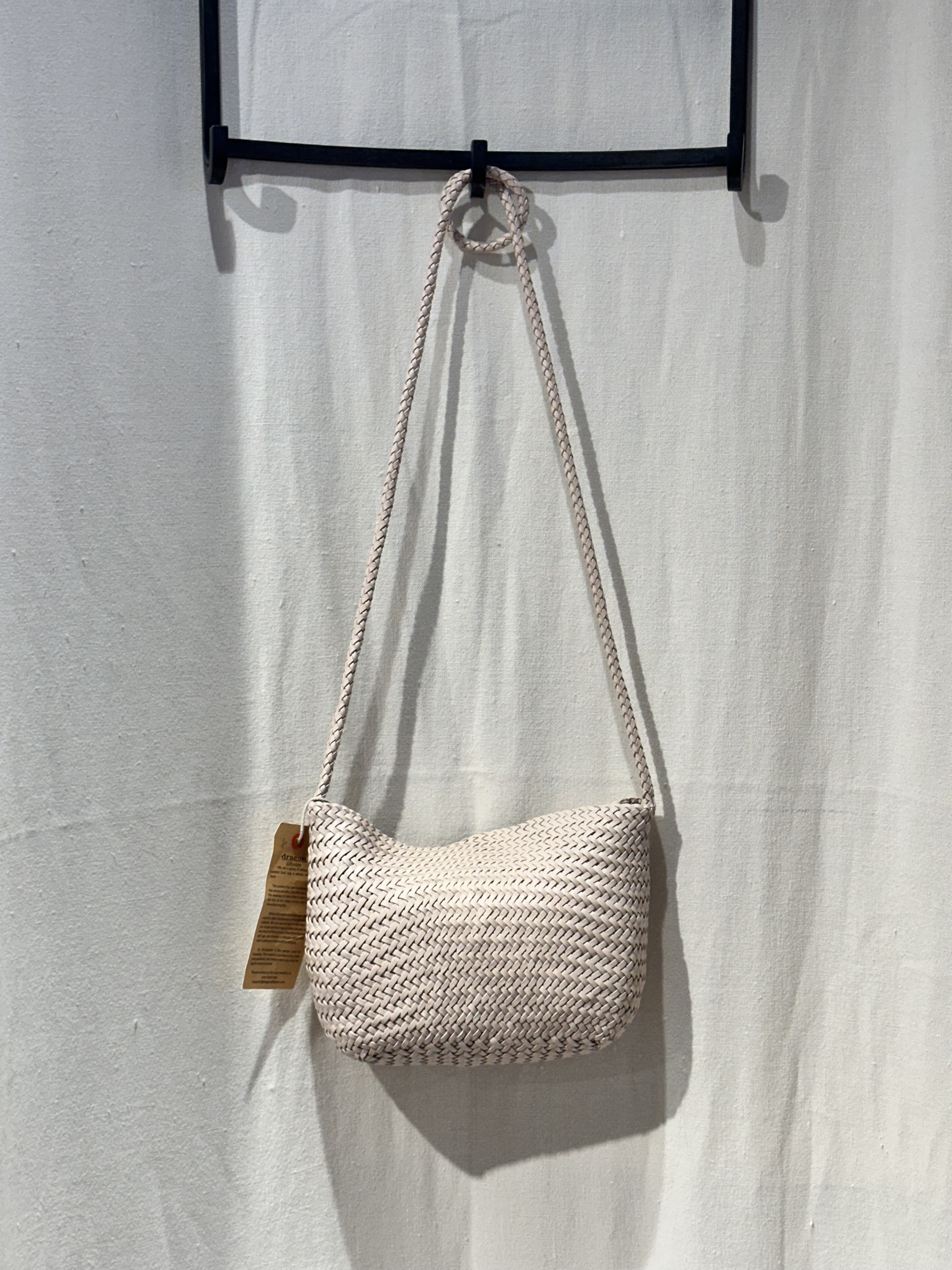 borsa a tracolla in pelle intrecciata a mano, chiusura a calamita.